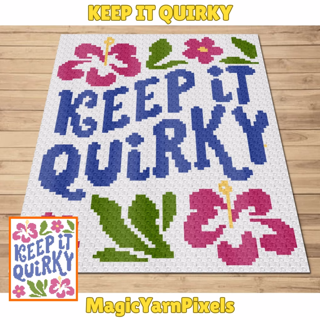 This design features pixel-style flowers and bold text that says “Keep It Quirky.” It uses a corner-to-corner technique to create a colorful and fun look. The bright pinks, greens, and blues make it stand out, making it a great choice for anyone who likes modern decor.